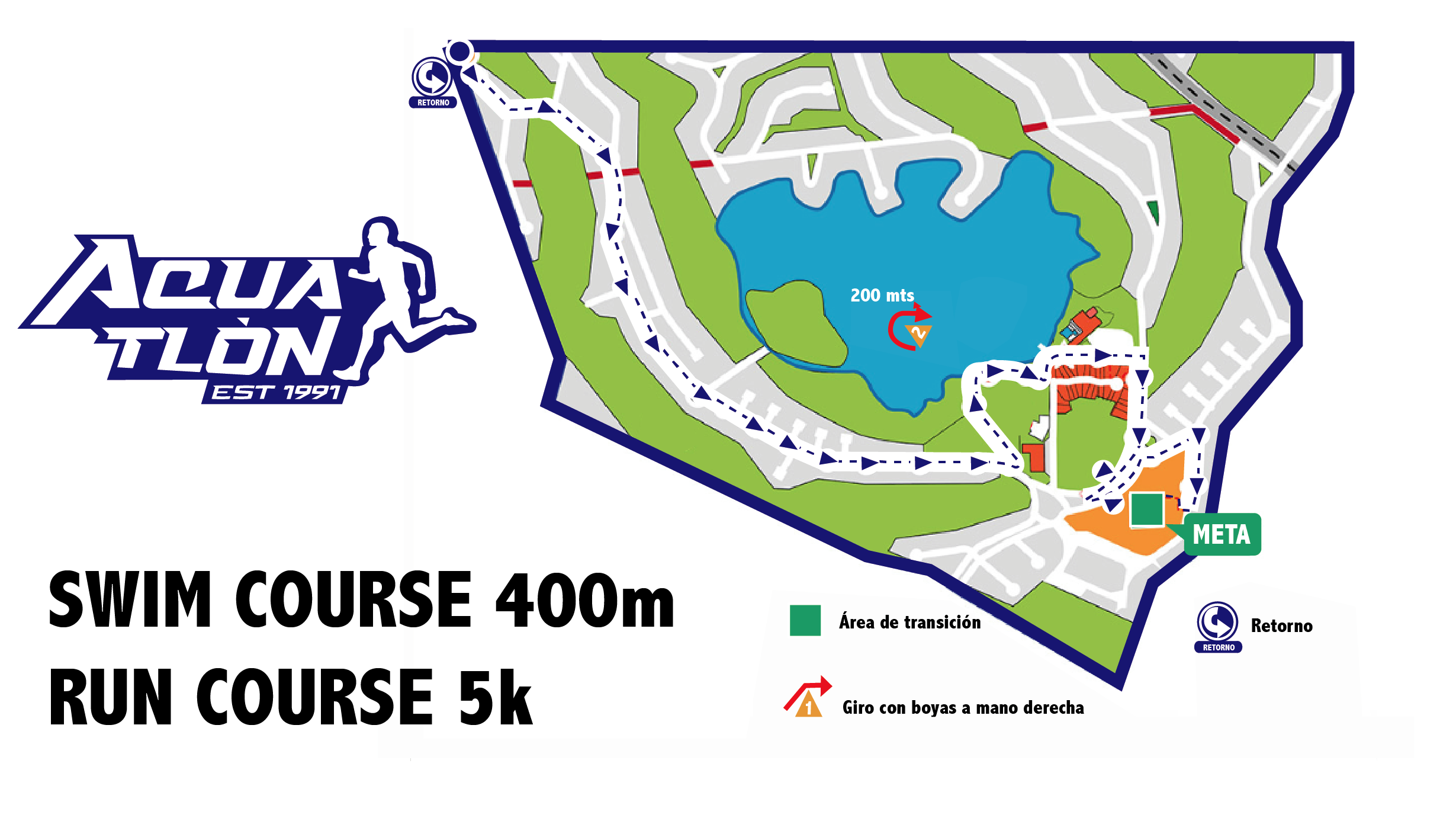 - Los ateltas saldrán de la transición para dar una vuelta en U (en sentido de las manecillas del reloj) para posteriormente correr a un lado del lago, hacia las calles principales del fraccionamiento de San Gil.