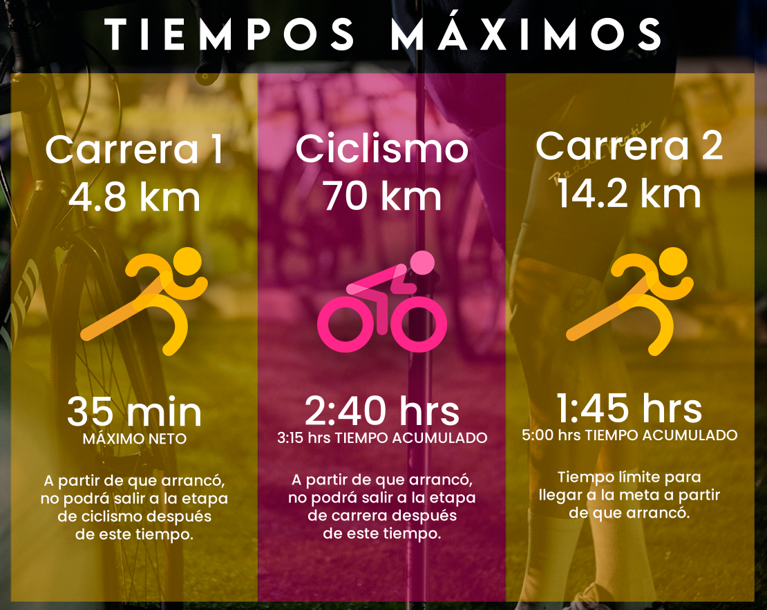 Importante: La entrega de Medalla y playera de finalista, se entregarán únicamente a los atletas que llegan a la meta en el tiempo oficial de competencia 5 horas y 45 minutos, y que completaron el circuito oficial del Duatlón San Gil de media distancia que será de 89 km