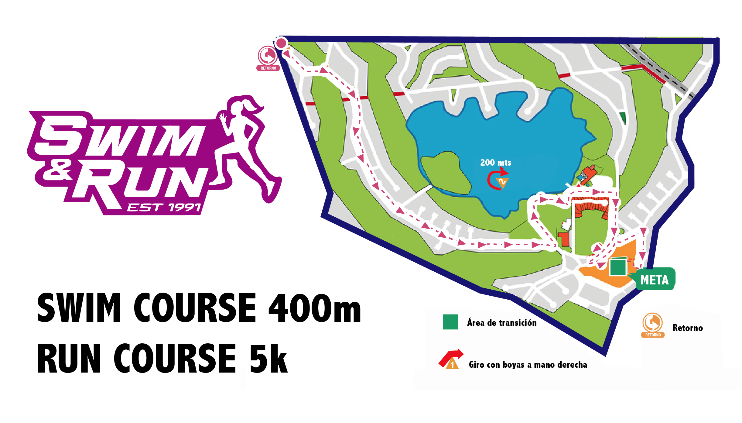 - Al terminar la natación, las atletas correrán a hacia el estacionamiento, para posteriormente girar en U (en el sentido de las manecillas del reloj) y tomar el borde del lago rumbo a la zona de los pinos, todo el recorrido estará marcado con marcas fluorescentes.